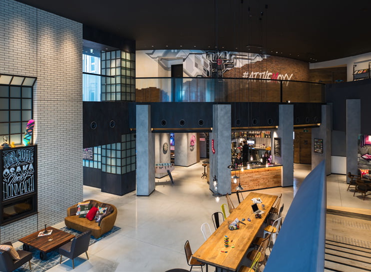 Sakairi, “Shin Umeda’nın ne tür bir alan olduğunu dikkate alarak, Moxy otel hakkındaki görüşümüz için bir öneride bulunduk” diyor. “İşletmeci, Moxy markasını çok iyi anladığımızı söyledi ve marka sahibi Shin Umeda’da bir Moxy otelinin olması için istekli olduklarını belirtti. Bu bağlamda işi aldık. Burada odaklanılacak üç anahtar kelime: yerel, bohem ve endüstriyel. Sadece marka konseptini kopyalayan bir tasarım önermek yerine, biraz daha yenilikçi bir kavramdan yola çıktık. Ayrıca çözülmesi gereken sorunun tanımını yaptık ve bir çözüm bulduk. Sanırım teklifimizin müşteriye anlamlı gelmesinin nedeni de bu.”